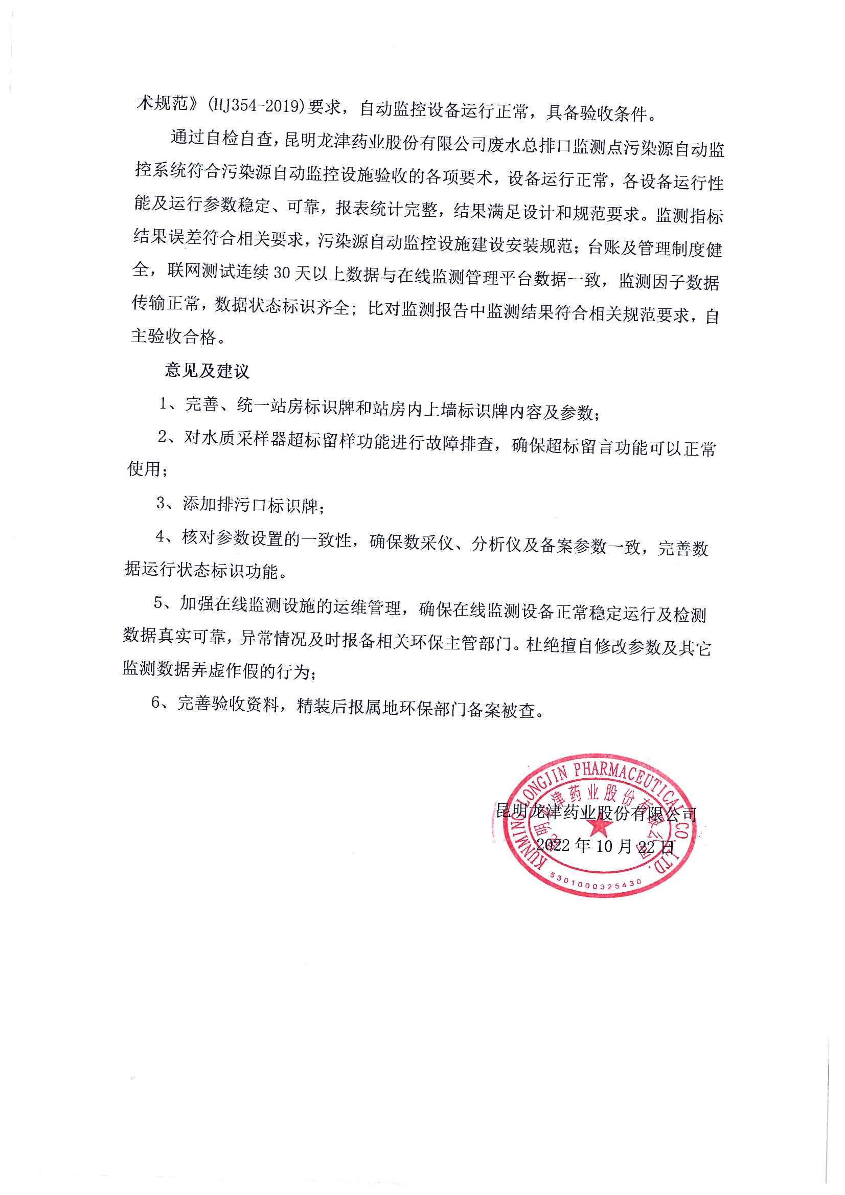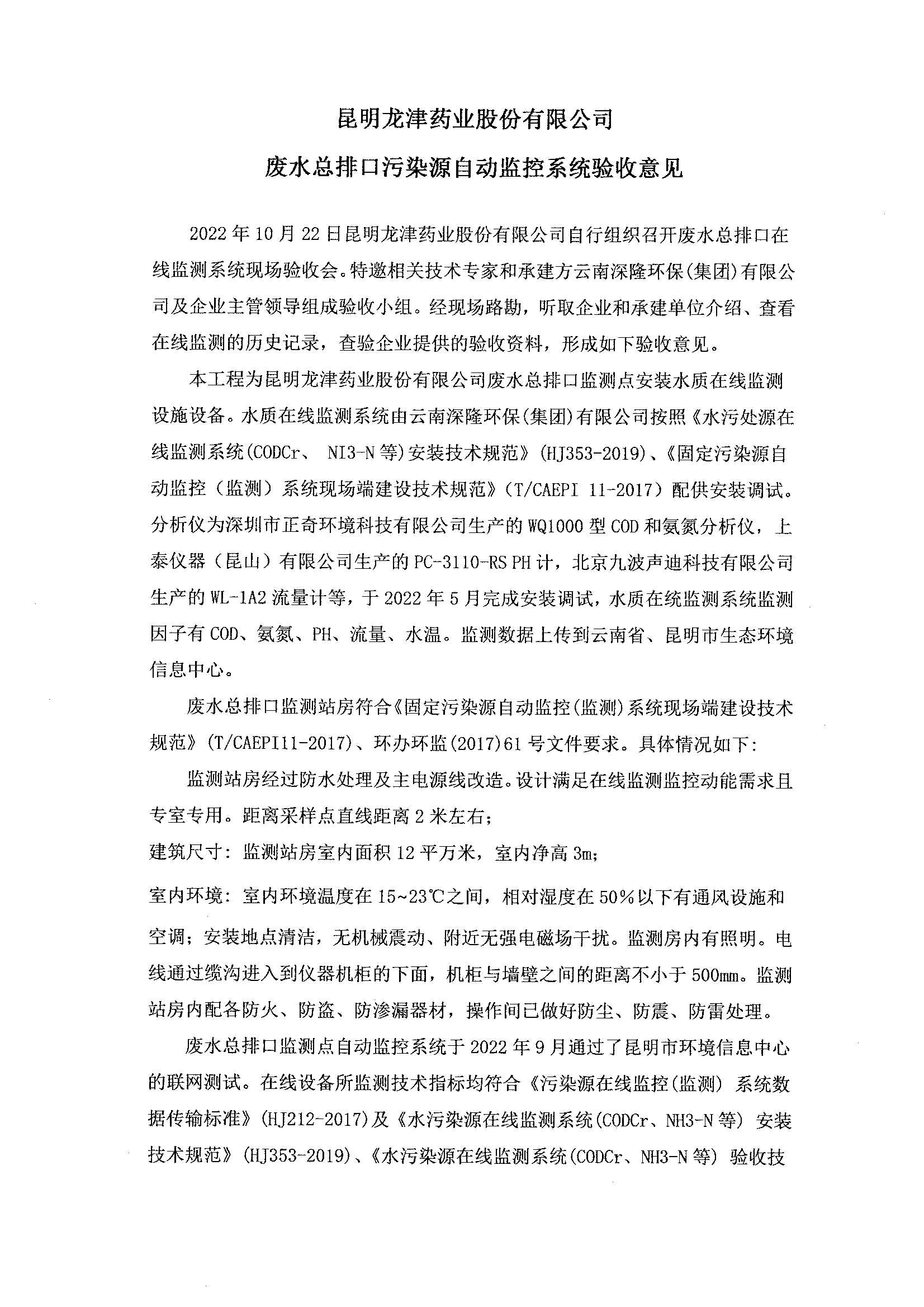 關(guān)于昆明龍津藥業(yè)股份有限公司水質(zhì)自動監(jiān)測驗收公示(公示時間2022.11.14-11.30)